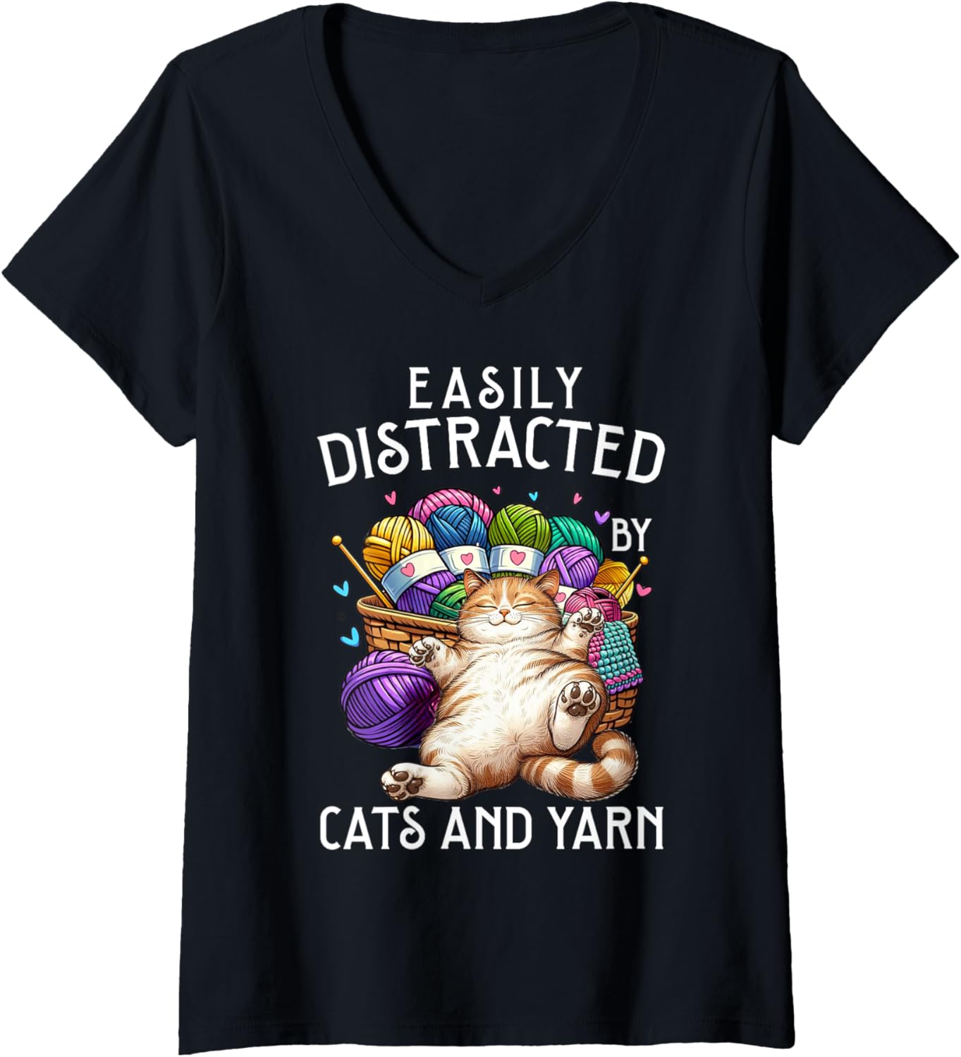 Womens Easily Distracted By Cats And Yarn Funny Knitting Crocheting V-Neck